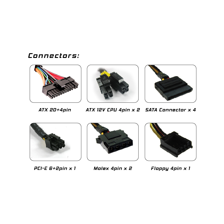 | 11 | Connectors | ATX 20+4 pin ATX 12V CPU 4pin x 2 SATA Connector x 4 PCI-E 6+2pin x 1 Molex 4pin x 2 Floppy 4pin x 1 |